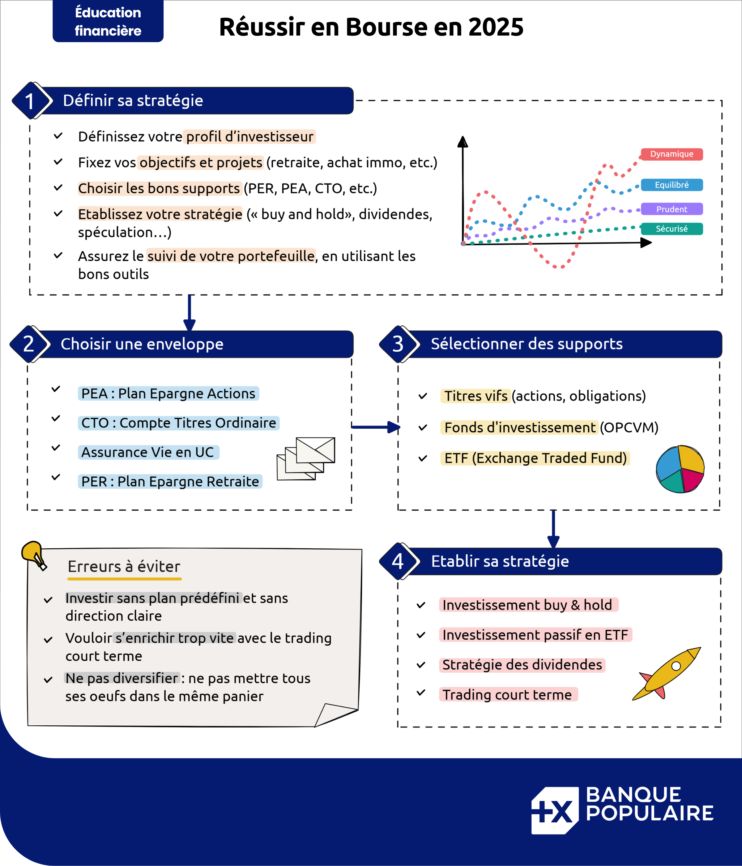 Entre recherche de rendement et volonté de diversification, l’investissement en Bourse ne laisse aucun épargnant indifférent. Mais tous ne savent pas par où commencer au moment de se lancer. Avec ce guide de bonnes pratiques, Banque Populaire vous propose une approche claire et progressive pour réussir vos premiers pas.